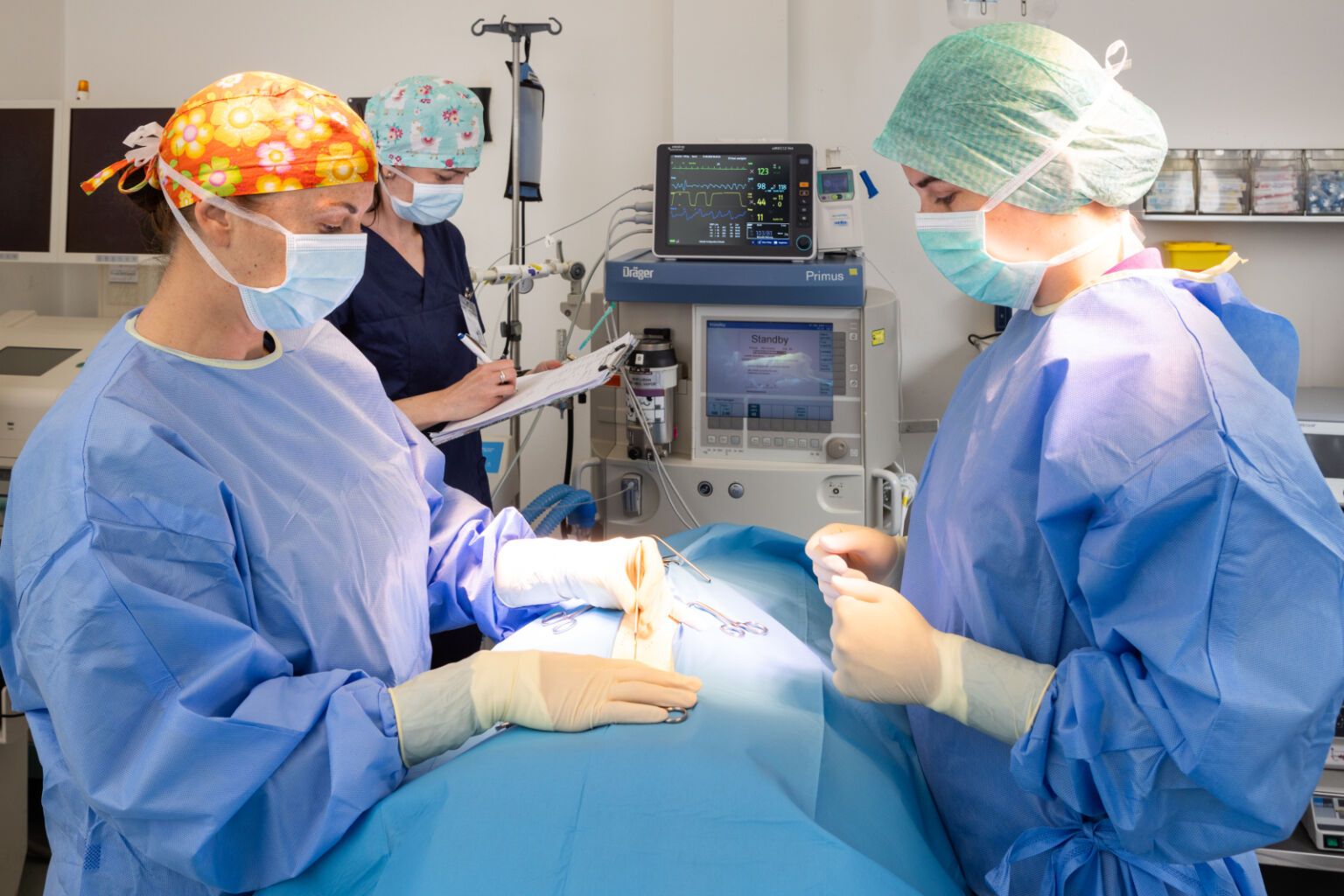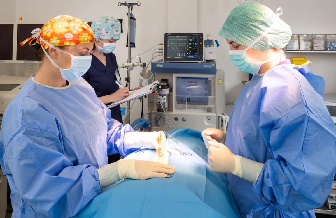 Für jede Operation sind Narkose und Schmerzmanagement unumgänglich (siehe Anästhesie und Schmerzmanagement). Aber keine Sorge – Ihr Haustier wird dabei natürlich von Anästhesist*innen und unserem erfahrenen tierärztlichen Personal überwacht. Im Normalfall können die Patienten am gleichen Tag noch nach Hause entlassen werden, nur in Ausnahmefällen kann es sein, dass eine stationäre Aufnahme über Nacht oder für einige Tage empfohlen wird. Das kann z.B. nach sehr großen und komplexen Operationen der Fall sein, bei denen die Patienten noch länger intensivmedizinisch überwacht werden müssen, bzw. wenn das Risiko für postoperative Komplikationen minimiert werden soll. Postoperative Komplikationen können z.B. Blutungen, Infektionen, Wundheilungsstörungen oder auch ein Aufbrechen der Nähte sein. Auch ein wirksames und individuell erstelltes Schmerzmanagement ist nach Operationen besonders wichtig – schmerzbedingtes Kratzen, Beißen oder Schlecken muss unbedingt vermieden werden.